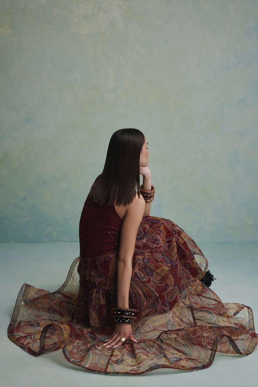 Elegant and expressive, this ensemble features a flowing paisley-print skirt. The tiered organza skirt drapes beautifully, finished with a concealed side zipper that enhances ease and movement. Perfect for festive evenings, artistic celebrations, or sophisticated statement dressing.