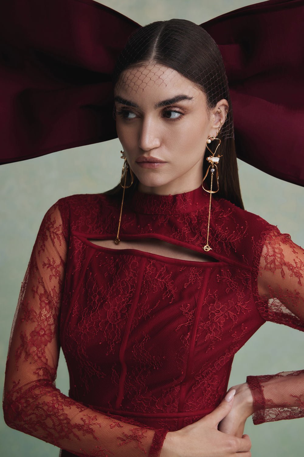 Striking and playful, this ruby mini dress features intricate lacework throughout the bodice and sleeves, complemented by a sleek front cut-out for a modern edge. The silhouette is elevated with a dramatic feather hem that adds lively movement and bold texture. Fully lined and finished with a concealed back zipper for a seamless fit, it’s perfect for parties, festive evenings, or high-impact celebrations.