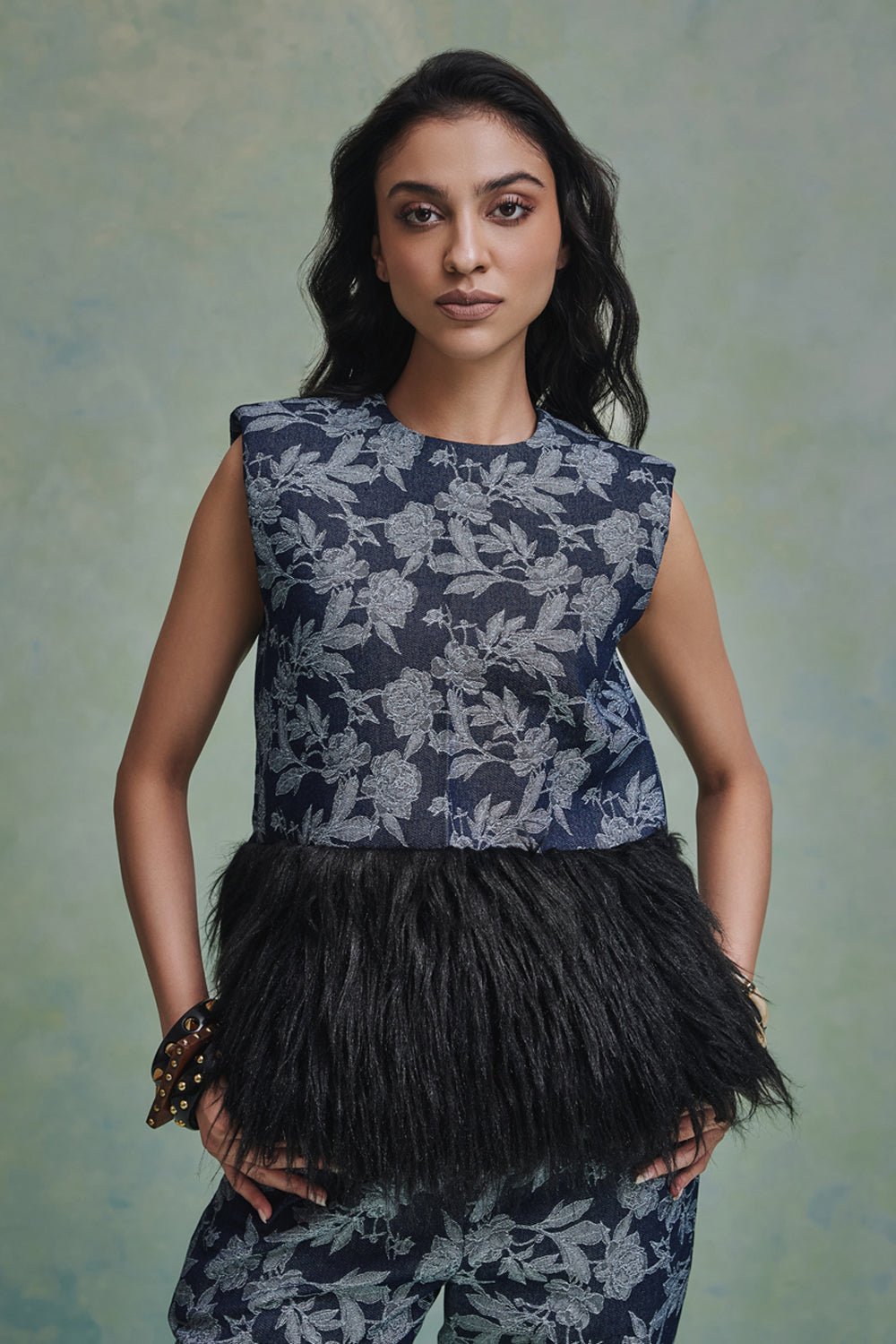 Modern and textural, this features a structured sleeveless top, crafted in a rich, floral jacquard. The silhouette is elevated with a dramatic fur panel that adds volume and movement, creating a bold contrast against the woven pattern. Effortlessly striking yet comfortable, this ensemble is perfect for evening gatherings, statement outings, or fashion-forward festive events.
