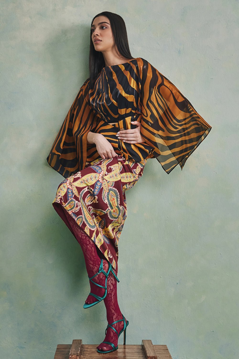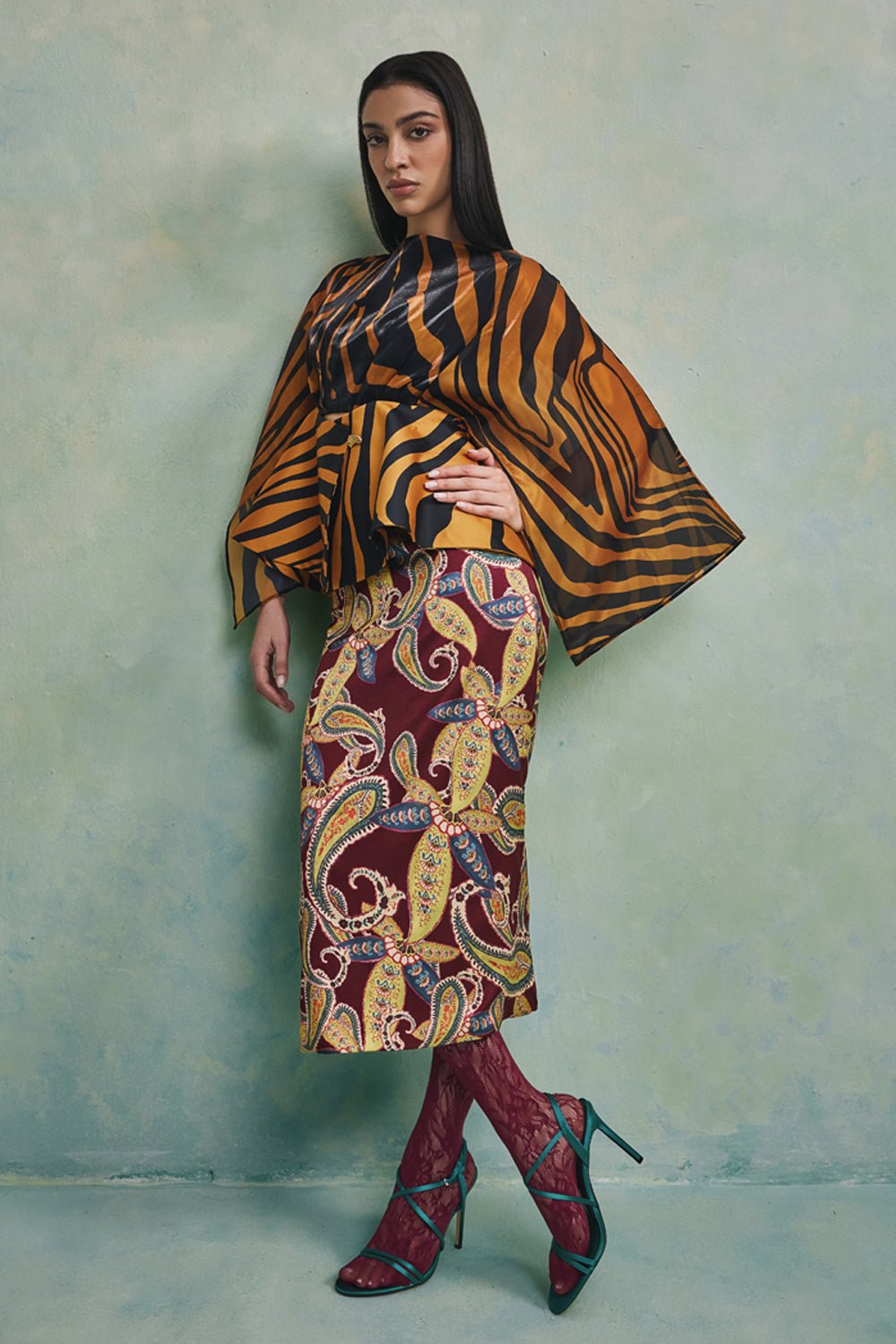 Bold and sculptural, this zebra-striped top features dramatic, free-flowing sleeves that create effortless movement and a statement silhouette. The structured bodice subtly flares at the waist, balancing fluidity with definition. Crafted in a rich, high-shine fabric that amplifies the pattern, it’s finished with a concealed back zipper for a clean, secure fit. Perfect for elevated evenings or fashion-forward styling.