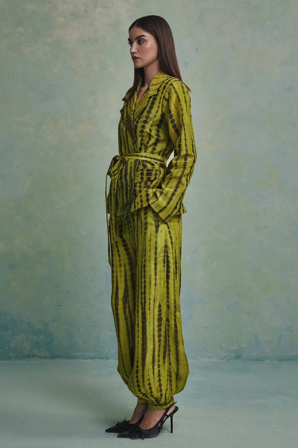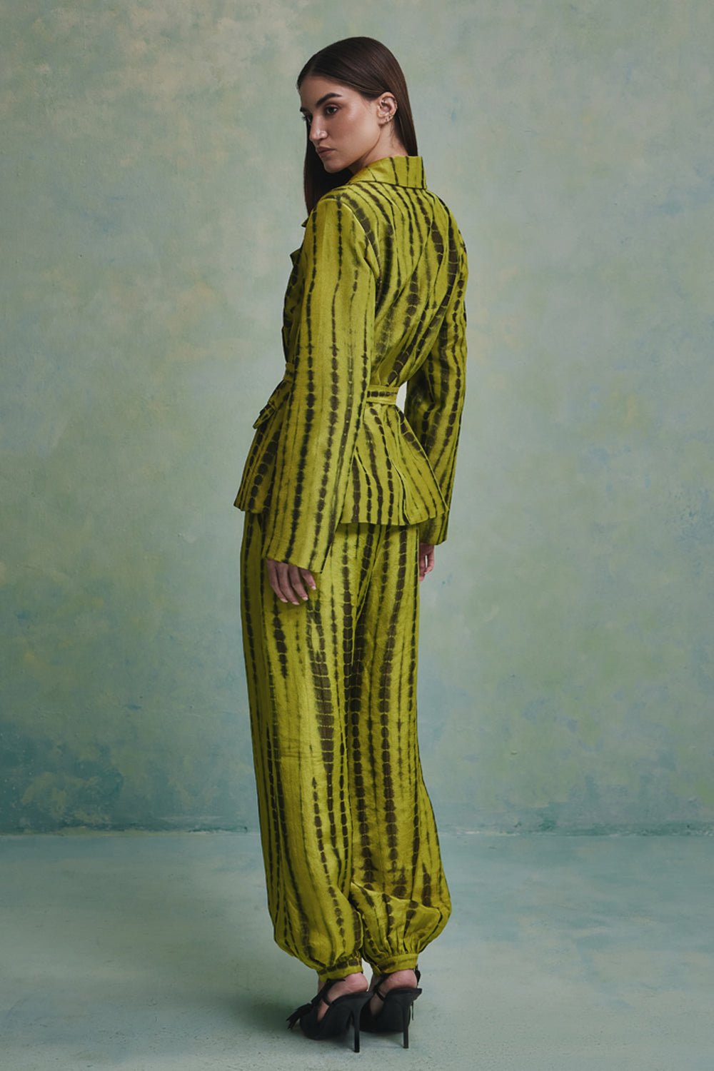 Fresh and contemporary, this features a tailored tie-dye–striped jacket. The jacket’s structured lapels and waist belt create a defined silhouette. Bold yet wearable, this set is perfect for elevated daytime styling, creative work settings, or chic casual evenings.
